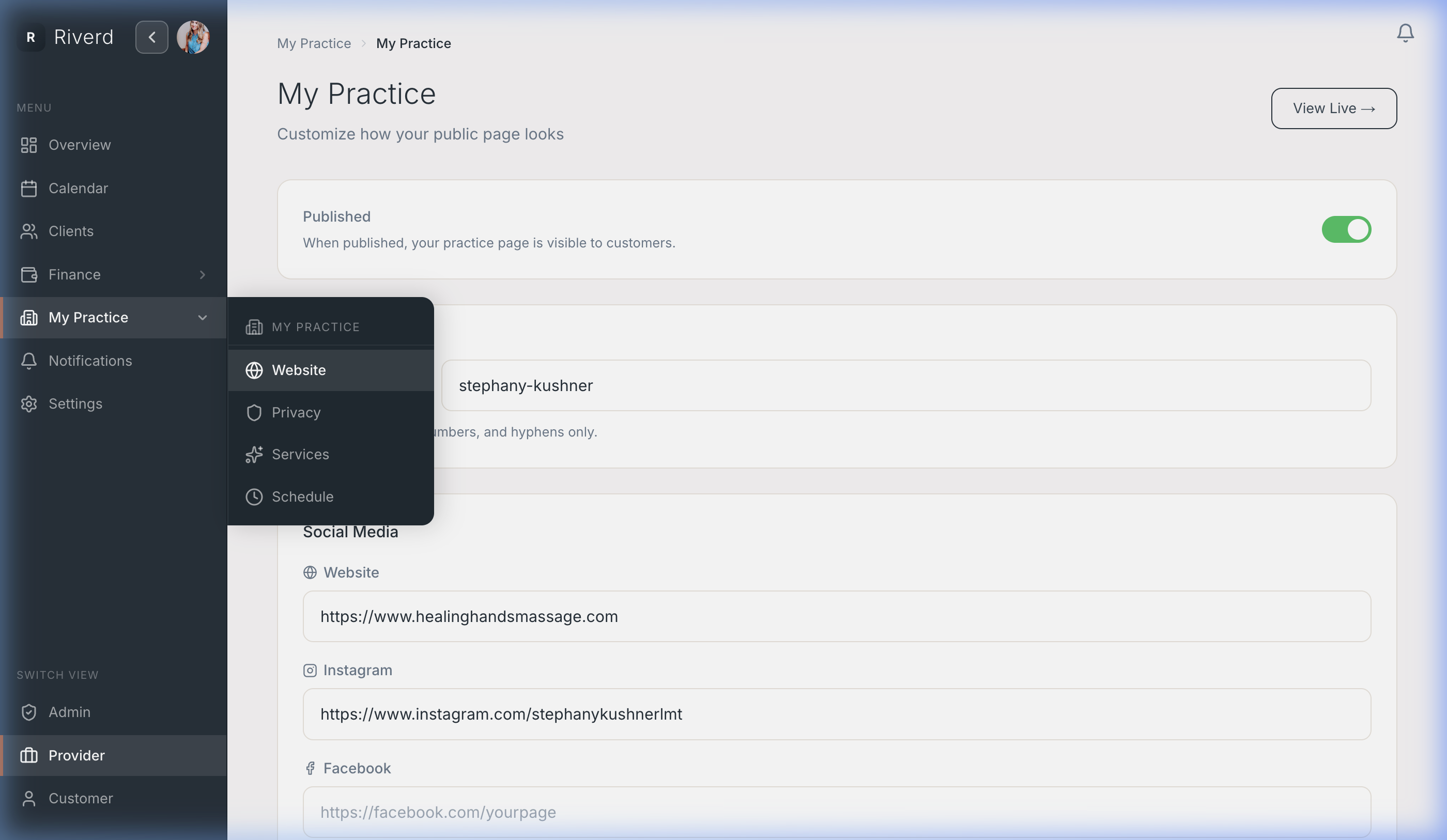 During onboarding, simply paste your Instagram, website, or Facebook links. Our AI analyzes your online presence — your bio, style, specialties — and generates a complete practice page with headline, description, and professional copy.