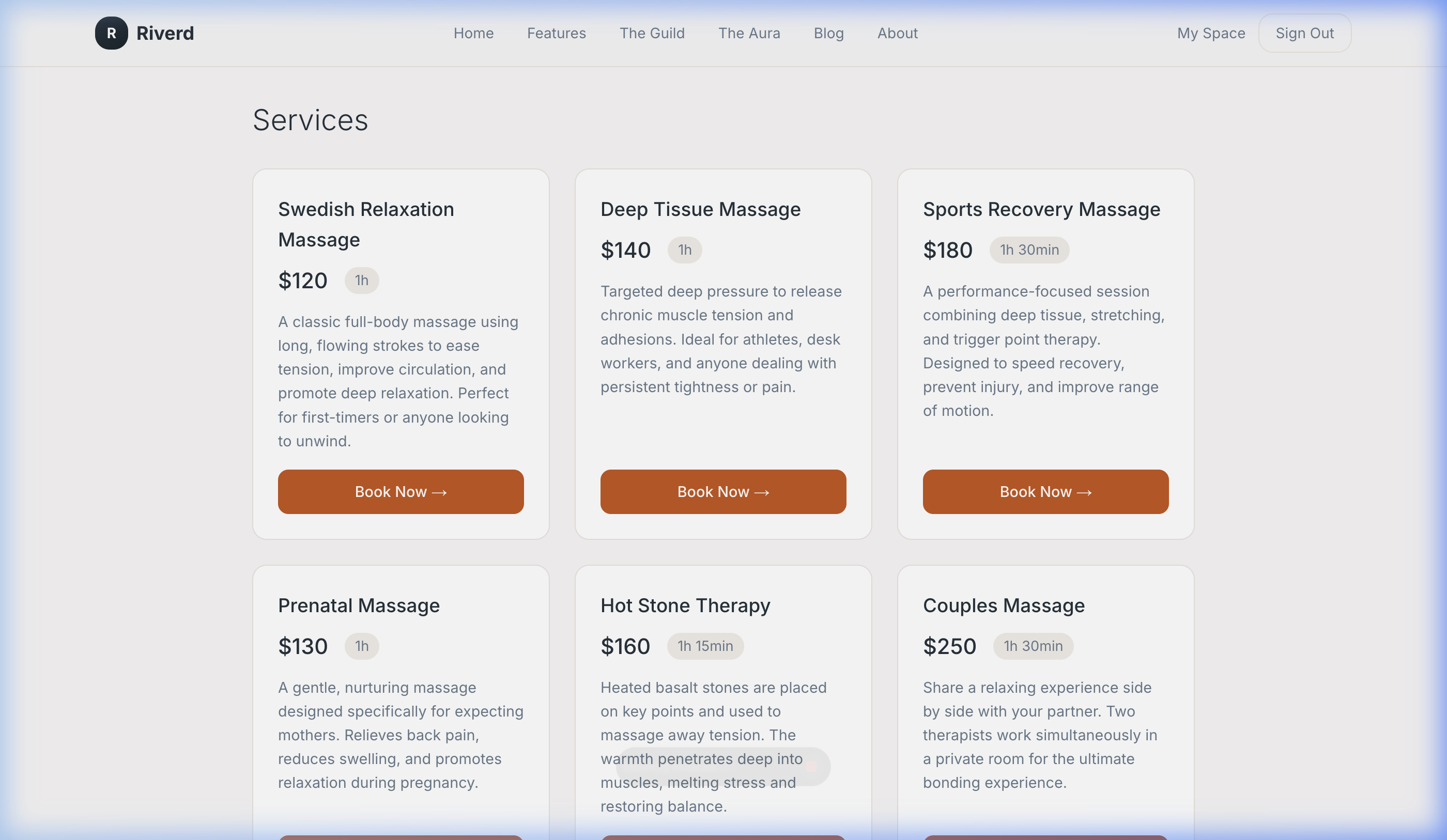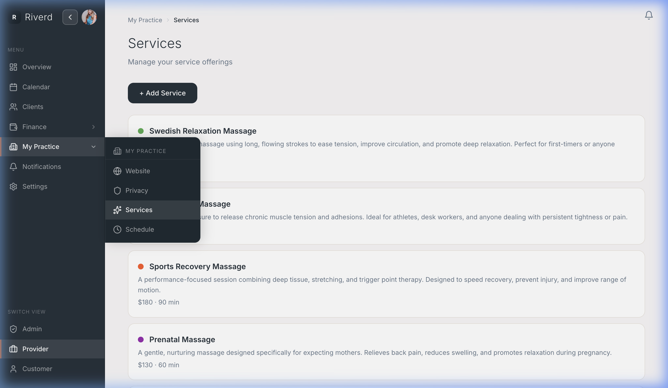 Whether you offer 30-minute consultations or 90-minute deep-tissue sessions, each service gets its own name, description, duration, and price. Clients see exactly what they're booking.